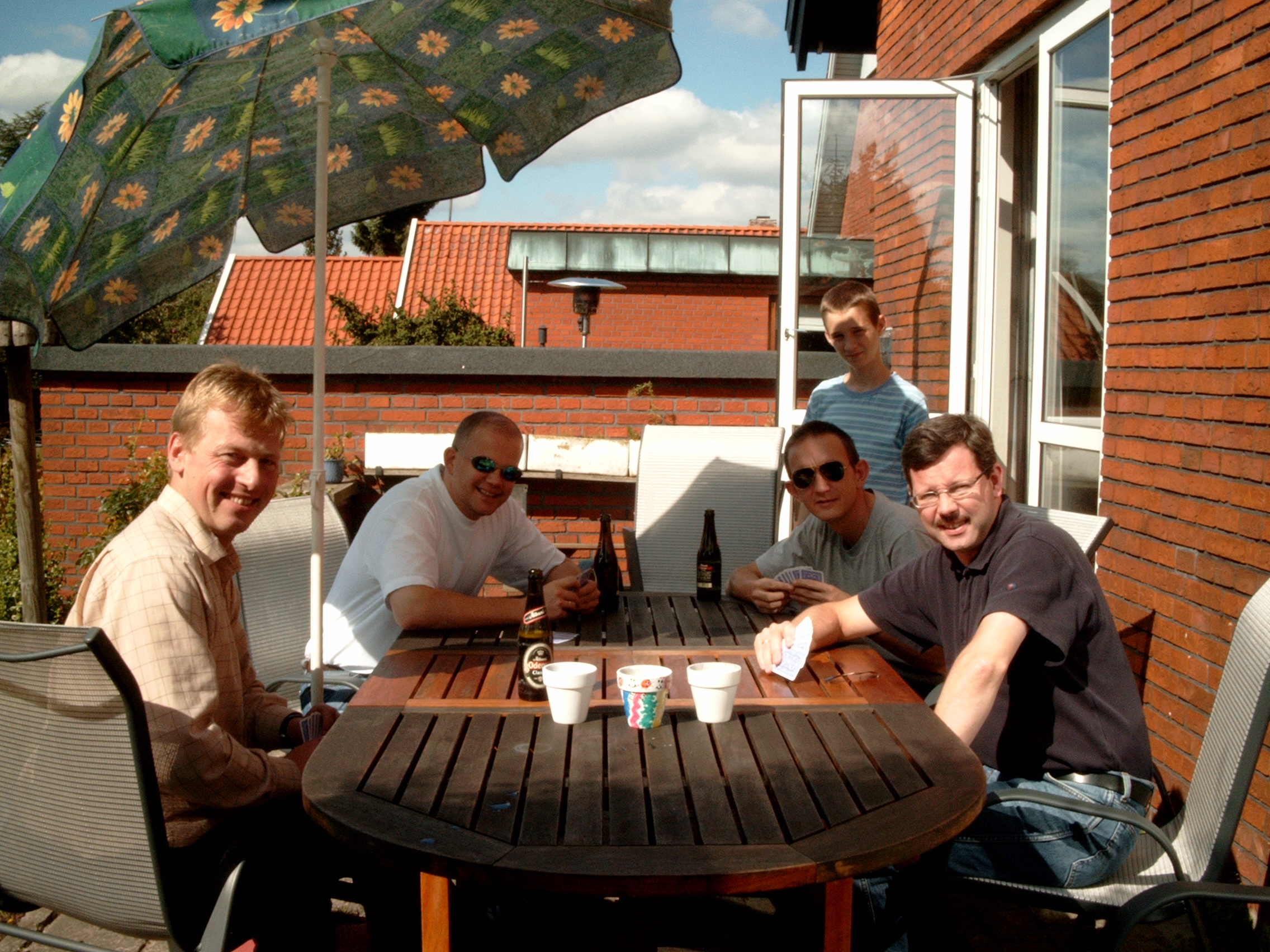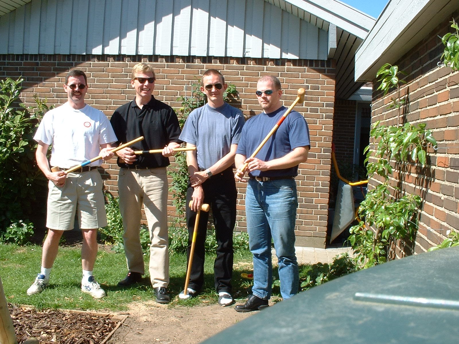 2002 picture showing four JSS members during a card-break, warning up for a game of croquet.